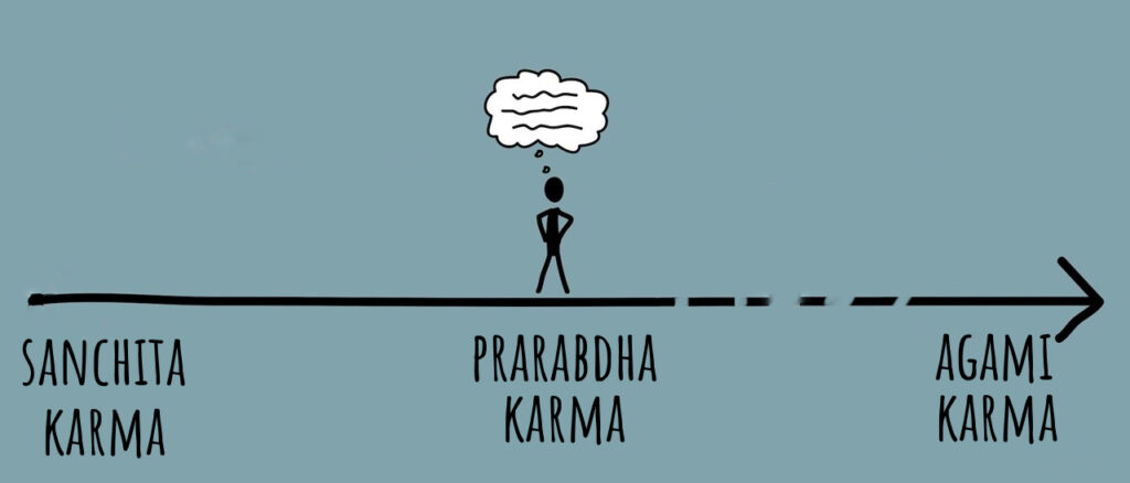 Karma is categorized into three types: सञ्चितकर्म Sanchita (past lives karma accumulated), प्रारब्दकर्म Prarabda (part of sanchita to be experienced in current life) and आगामिकर्म Āgāmi (current actions shaping future karma). Often we wonder do we have control over our destiny ? In other words: where does Spiritual practices fit into this karma’s eco-system.